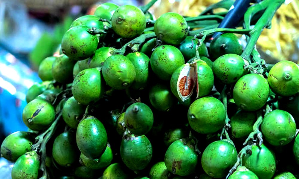Green areca nut has a fresh, peppery taste, but it can also be bitter to varying degrees depending on the variety. Areca nuts are chewed with betel leaf for their effects as a mild stimulant, causing a warming sensation in the body and slightly heightened alertness.